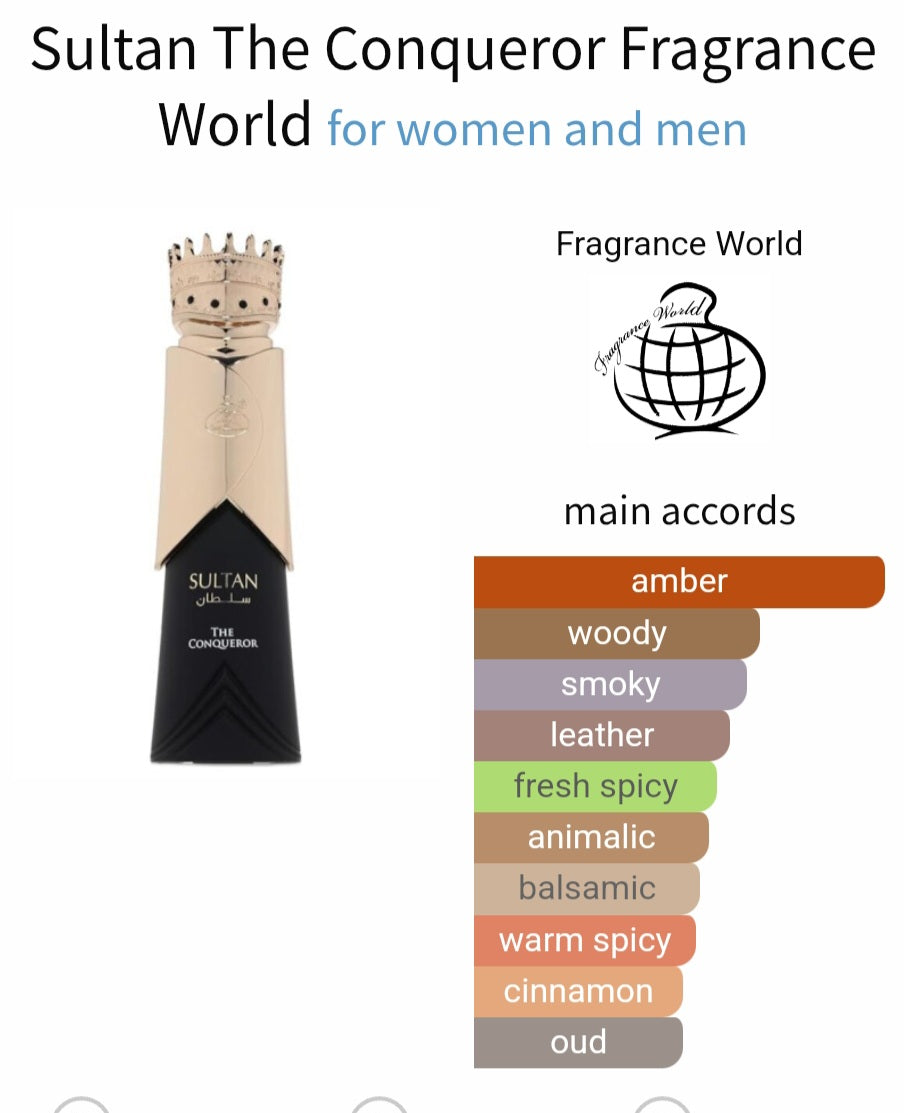 Sultan The Conqueror by Fragrance World is a Leather fragrance for women and men. This is a new fragrance. Sultan The Conqueror was launched in 2024. Top notes are Cumin, Cinnamon, Clary Sage and Cardamom; middle notes are Leather, Incense and Cedarwood; base notes are Labdanum, Oud, Patchouli, Amber and Guaiac Wood.